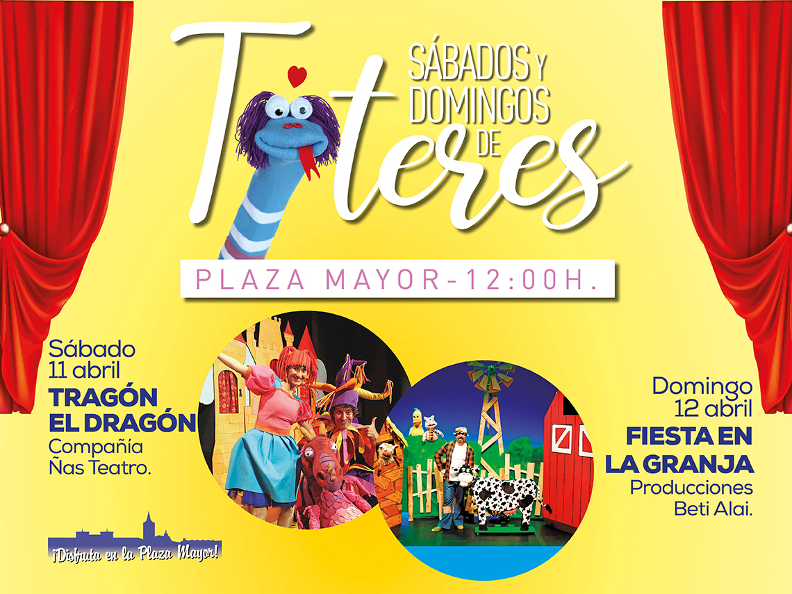• Así, mañana, sábado, 11 de abril, a las 12:00 horas tendrá lugar el espectáculo, “Tragón el dragón”, de la Compañía Ñas Teatro, mientras que el domingo, 12 de abril, será el turno de Fiesta en la granja” de Producciones Beti Alai. A estas citas le seguirán el sábado, 18 de abril, “Blancanieves”, de la compañía Tropos Teatro de Títeres y el domingo, 19 de abril, “El gato con botas”, de la Compañía El Retablo de la ventana